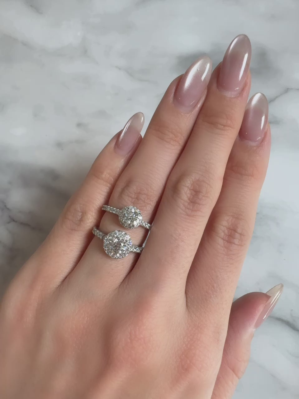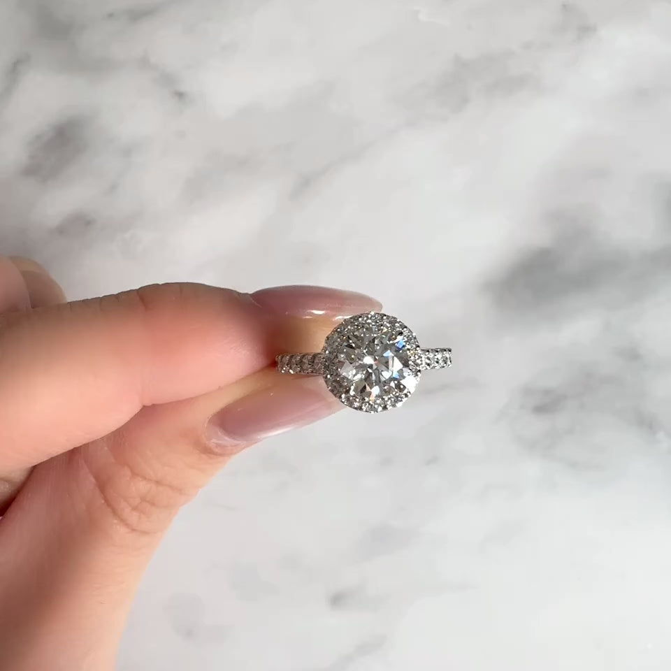 センターには強く輝くラウンドブリリアントカット、そして周囲を彩るのは贅沢な大粒のメレダイヤ。