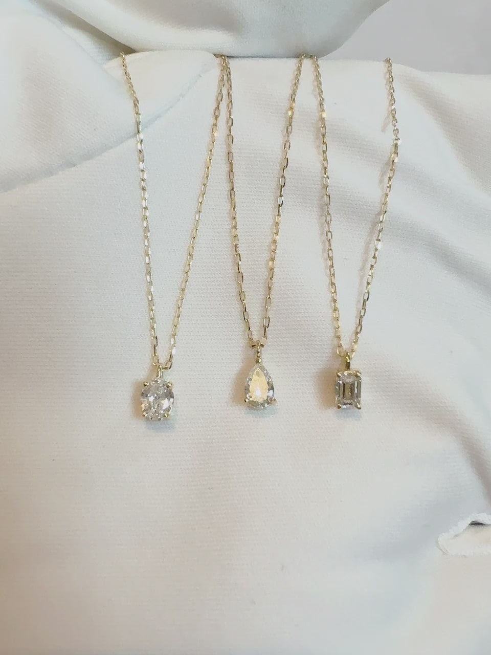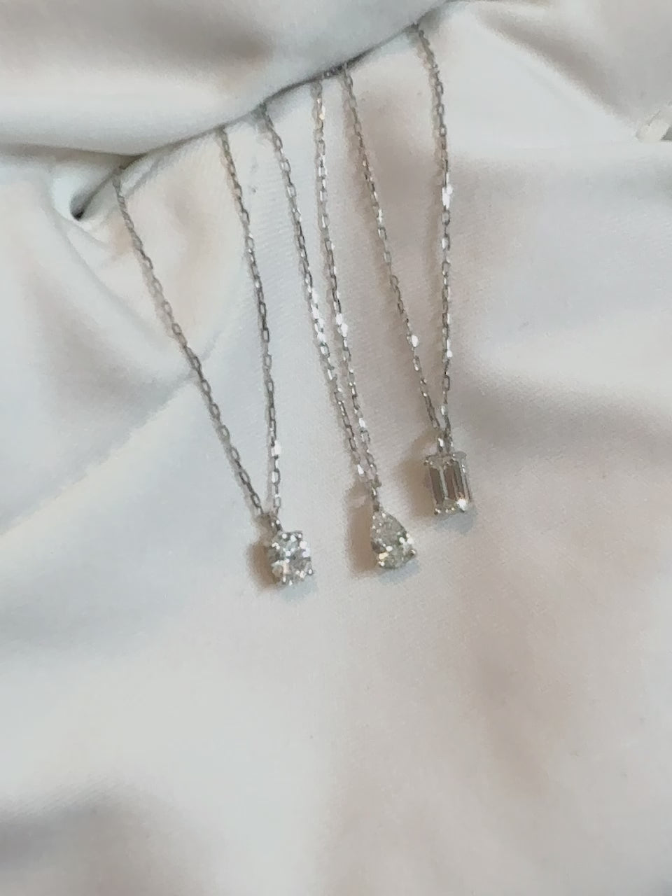 小粒のエメラルドカット・オーバル・ペアシェイプのラボグロウンダイヤモンドをシンプルな一粒ネックレスに。肌にも馴染みやすいミニサイズはそのままでも、他のネックレスとの重ね付けにもピッタリです。