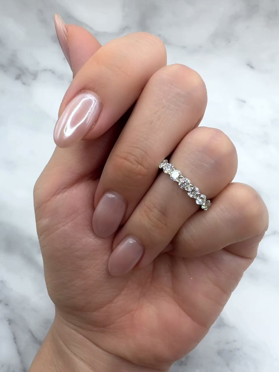0.1ctずつのラボグロウンダイヤモンドが贅沢に並ぶフルエタニティリング。石の丸い輪郭が際立つデザインが、指元に上品な煌めきを添えます。